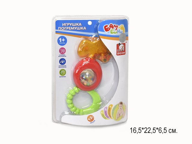 Первая игрушка малыша - это погремушка. С её помощью малыш знакомится со звуками, формами, цветами. Игрушка развивает у ребёнка слуховое, зрительное и тактильное восприятие. Звук появляется при встряхивании. А силиконовый прорезыватель поможет легче появиться первым зубкам.