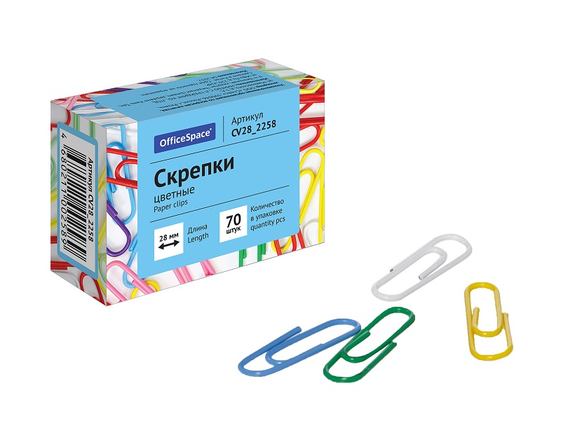 кв_Скрепки арт. CV28_2258 28мм, OfficeSpace, 70шт., цветные, карт. упаковкаДлина: 28 мм
