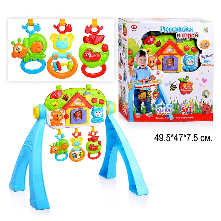 Столик развив. арт. 7485" Муз. 49.5*47*7.5 в коробкеНа игровой панели малыш найдет красочные кнопочки, каждая из которых представляет красивую яркую картинку и воспроизводит определенный звук при нажатии. Панель можно закрепить на 4-х ножках, чтобы малыш играл стоя, можно снять ее, и позволить ребенку играть сидя или лежа, или повестить на перила кроватки.