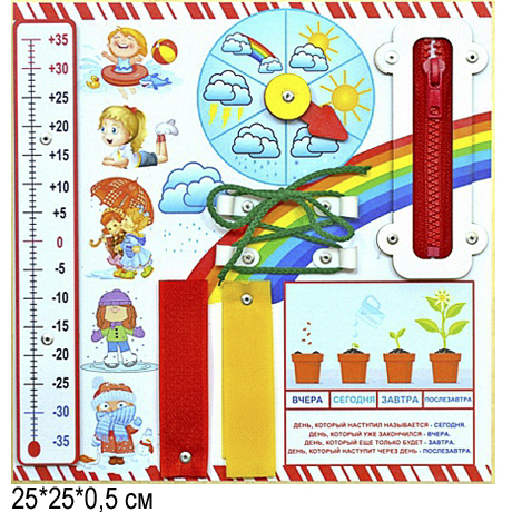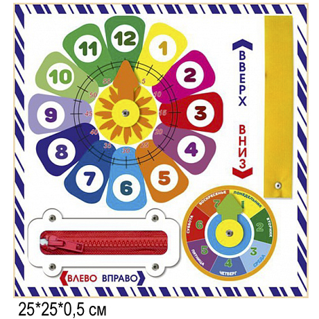 К основной панели снизу крепятся 3 игрушки, которые можно снять при желании. Каждая из игрушек выполняет свою определенную функцию. Улитка издает определенный звук при нажатии на ее раковину. Медвежонок выполняет роль погремушки, а также развивает мелкую моторику, благодаря 3-м колечкам, нанизанным на ось, которые так интересно перебирать. Яблоко с гусеницей помогает понять ассоциативный ряд и улучшает пространственное мышление.
